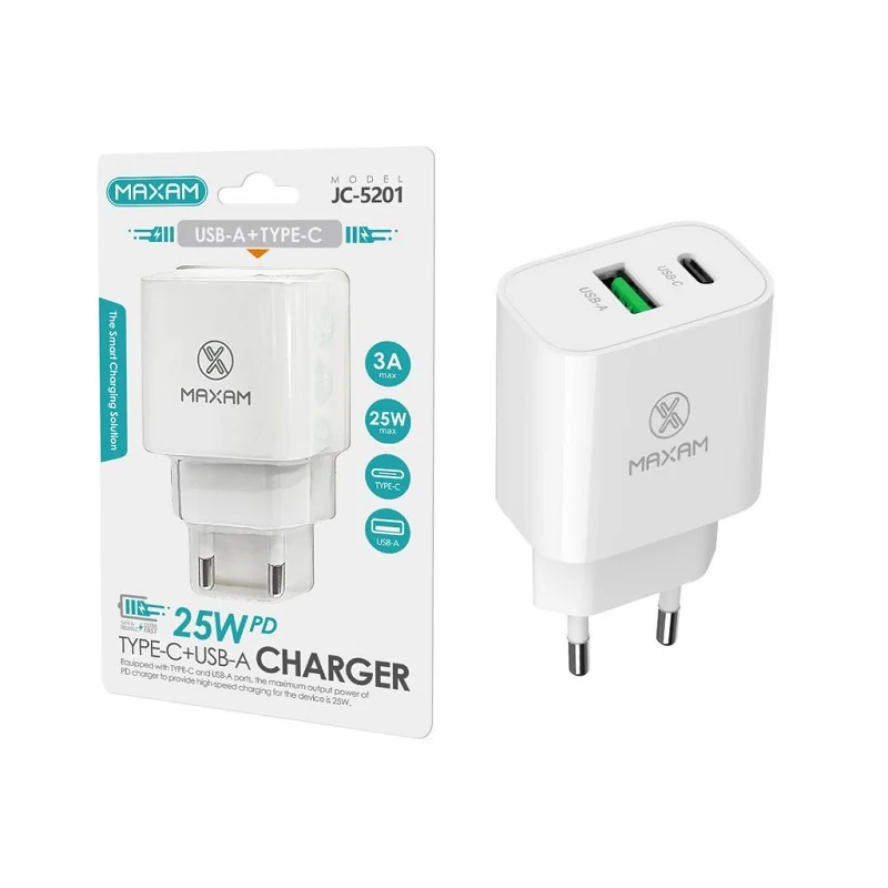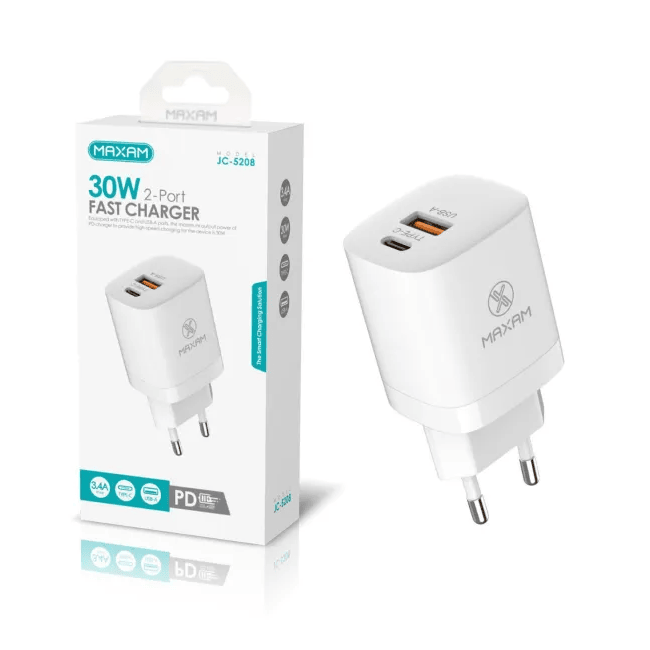 Cargador Maxam con capacidad de carga hasta 30W, usando solo un puerto. Utilizando los 2 puertos a la vez, la potencia bajará para repartir la alimentación. Tiene 2 puertos, uno USB-A y otro USB-C Especificaciones Rango de voltaje de entrada: CA 100-240 V, 50-60 Hz, 0,85 A Potencia de salida: 30W Max. USB A: 5 V⎓3A / 9 V⎓2 A / 12 V⎓2,5 A Tipo-C: 5 V⎓3A / 9 V⎓2 A / 12 V⎓2,5 A USB-A+ USB-C: 5V⎓3,4A Max *Las fotos del producto no son contractuales y están sujetas a cambios sin previo aviso. El precio original era: 20,00 €.15,00 €El precio actual es: 15,00 €. -